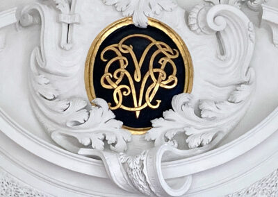 In diesem weiten Saal in der Beletage des Herrenhauses hat der angesehene Tessiner Stuckateur Giovan Battista Clerici einen besonderen Höhepunkt gesetzt. Ein plastisch ausgearbeitetes Band aus Allegorien und Symbolen umgibt den oberen Deckenspiegel. Typisch für die Barockzeit ist die Darstellung von Personifikationen der Jahreszeiten, der Himmelsrichtungen und vier Winde. Zudem werden Blumen und Früchte in großen Vasen durch Putten präsentiert. Sie unterstreichen die Verbindung zur Natur auf diesem landwirtschaftlichen Gut. In den Mittelkartuschen der Schmalseiten befinden sich Arrangements mit Kriegsgerät, Fahnen und Trophäen. Sie stehen allgemein für Ruhm, Ehre und Stärke in militärischem Zusammenhang und hatten möglicherweise in der Entstehungszeit dieses Stucks den Großen Nordischen Krieg zwischen 1700 und 1721 als aktuellen Zeitbezug. Für den Entwurf der Stuckdecke verwendete Clerici einzelne Motive aus den Kupferstichvorlagen seines Landsmanns Carlo Maria Pozzi.