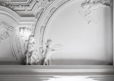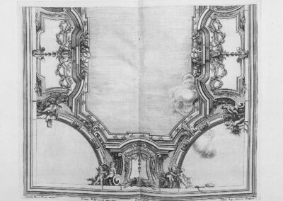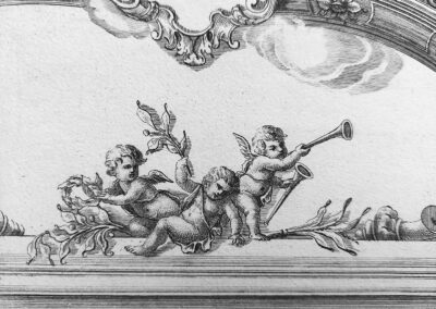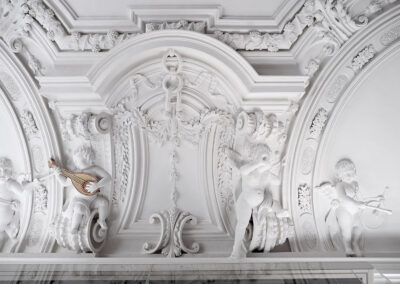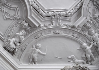 Der heutige Ulmer Salon wurde als prächtiger Repräsentationsraum konzipiert, in dem sicher auch Musik gespielt wurde. Das legt der opulente, fast dreidimensionale Stuck nahe, dessen Hauptthema musizierende Putten sind. Auch zu diesem Thema wählte Giovan Battista Clerici aus den Stichvorlagen von Carlo Maria Pozzi die passenden Figurengruppen aus. So kann man u.a. einen Sänger mit Notenblatt finden. Das himmlische Kammerorchester setzt sich aus verschiedenen Bläsern mit Flöte, Trompete und Posaune, Zupfinstrumenten wie Theorbe oder Laute und einem tamburinartigen Schlagwerk zusammen. 2025 wird dieses Erlebnis wieder hörbar werden, wenn der Artist in Residence Ercole Nisini mit seinem Ensemble den Stuck auf historischen Instrumenten zum Klingen bringt.