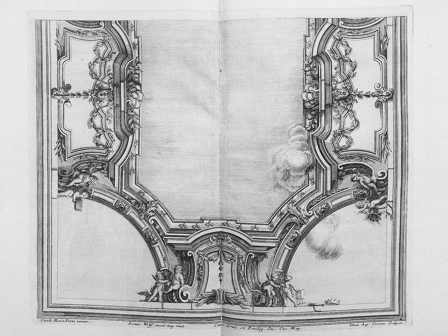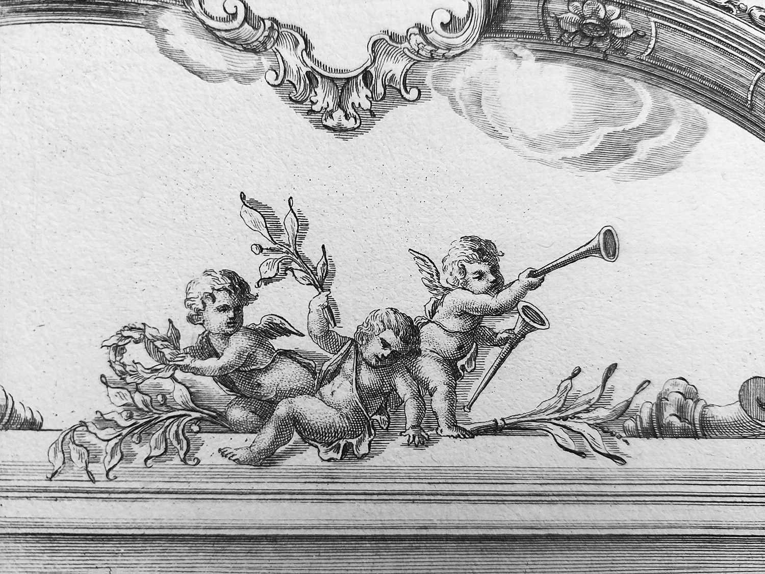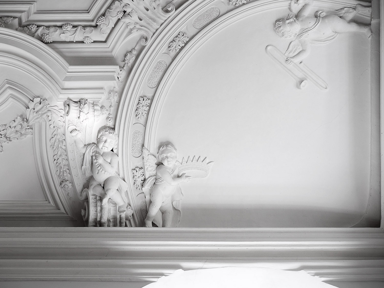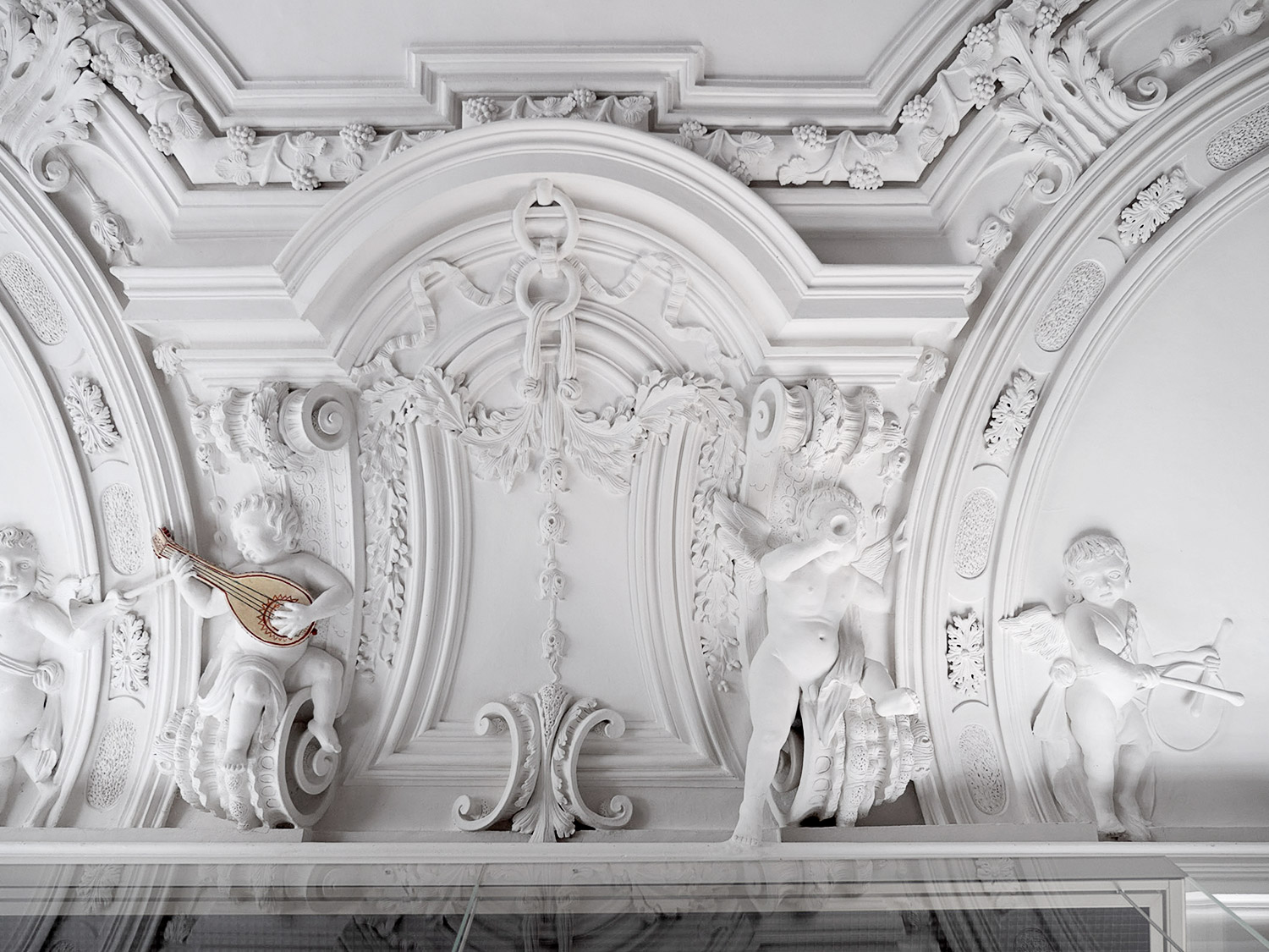 Der heutige Ulmer Salon wurde als prächtiger Repräsentationsraum konzipiert, in dem sicher auch Musik gespielt wurde. Das legt der opulente, fast dreidimensionale Stuck nahe, dessen Hauptthema musizierende Putten sind. Auch zu diesem Thema wählte Giovan Battista Clerici aus den Stichvorlagen von Carlo Maria Pozzi die passenden Figurengruppen aus. So kann man u.a. einen Sänger mit Notenblatt finden. Das himmlische Kammerorchester setzt sich aus verschiedenen Bläsern mit Flöte, Trompete und Posaune, Zupfinstrumenten wie Theorbe oder Laute und einem tamburinartigen Schlagwerk zusammen. 2025 wird dieses Erlebnis wieder hörbar werden, wenn der Artist in Residence Ercole Nisini mit seinem Ensemble den Stuck auf historischen Instrumenten zum Klingen bringt.