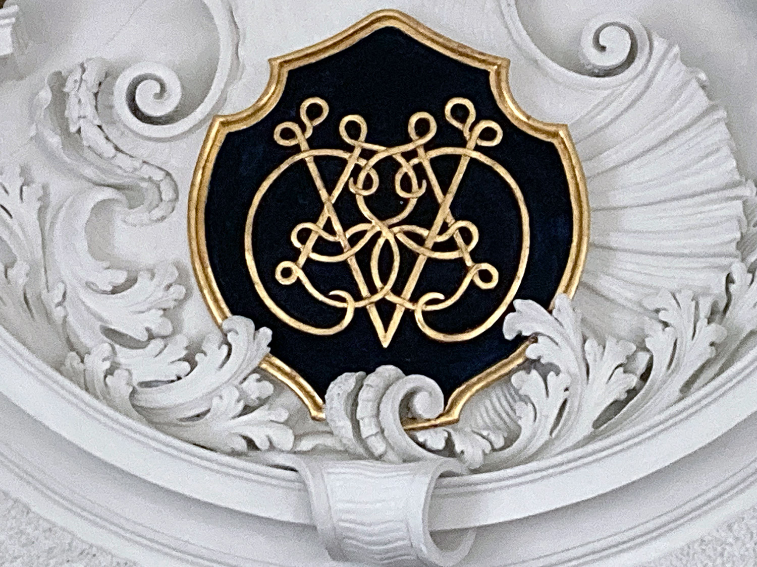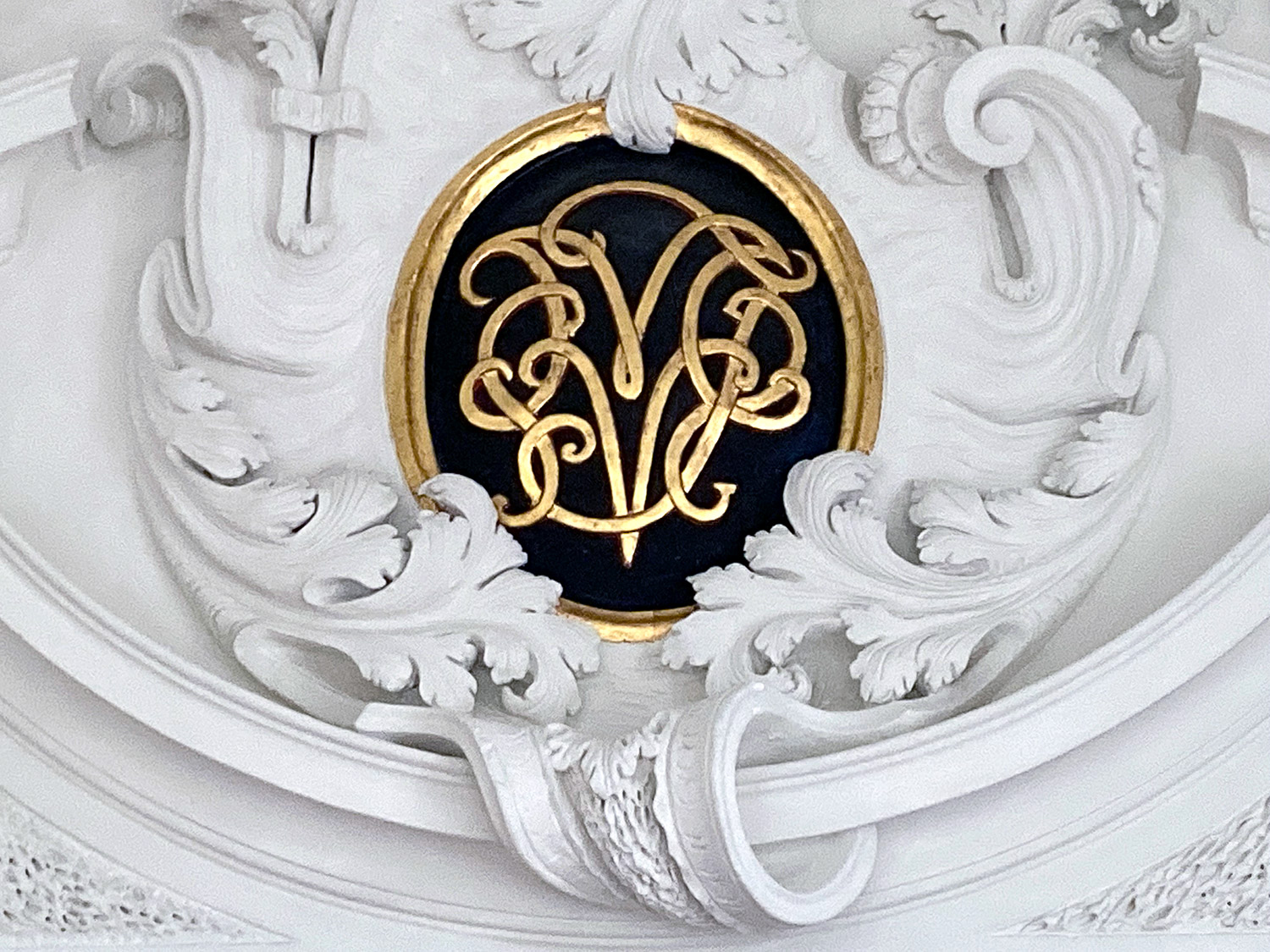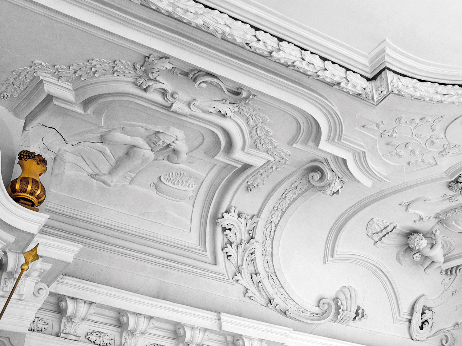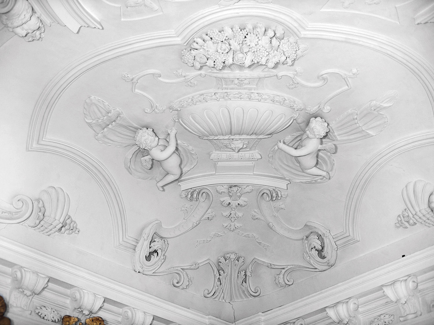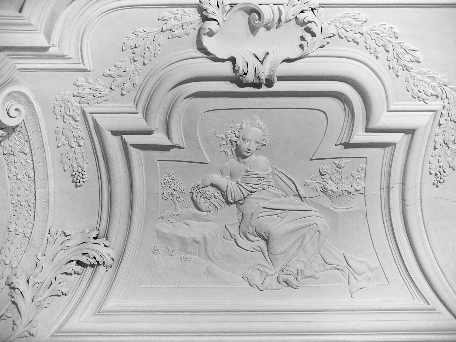 In diesem weiten Saal in der Beletage des Herrenhauses hat der angesehene Tessiner Stuckateur Giovan Battista Clerici einen besonderen Höhepunkt gesetzt. Ein plastisch ausgearbeitetes Band aus Allegorien und Symbolen umgibt den oberen Deckenspiegel. Typisch für die Barockzeit ist die Darstellung von Personifikationen der Jahreszeiten, der Himmelsrichtungen und vier Winde. Zudem werden Blumen und Früchte in großen Vasen durch Putten präsentiert. Sie unterstreichen die Verbindung zur Natur auf diesem landwirtschaftlichen Gut. In den Mittelkartuschen der Schmalseiten befinden sich Arrangements mit Kriegsgerät, Fahnen und Trophäen. Sie stehen allgemein für Ruhm, Ehre und Stärke in militärischem Zusammenhang und hatten möglicherweise in der Entstehungszeit dieses Stucks den Großen Nordischen Krieg zwischen 1700 und 1721 als aktuellen Zeitbezug. Für den Entwurf der Stuckdecke verwendete Clerici einzelne Motive aus den Kupferstichvorlagen seines Landsmanns Carlo Maria Pozzi.